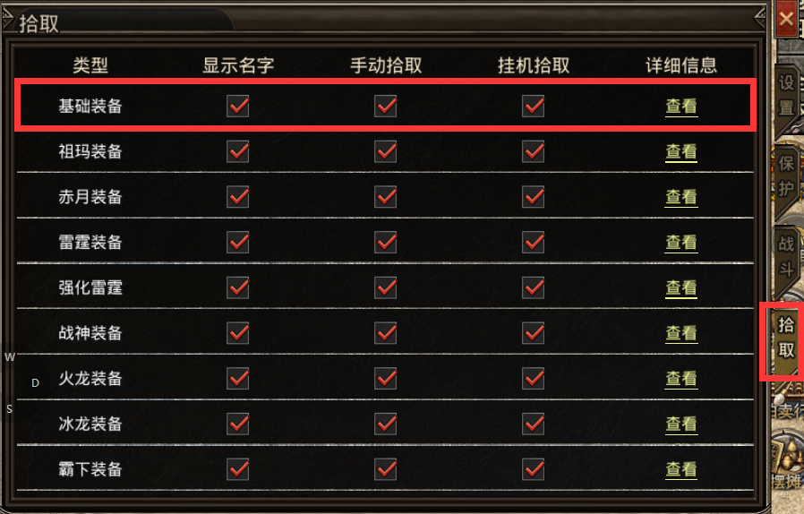 1.背包拾取装备设置(等级装备),当你需要基础装备时,只需要如下图所示,将你已经装备了不想拾取的等级装备【是否拾取】按钮取消即可解决背包被垃圾装备占满。