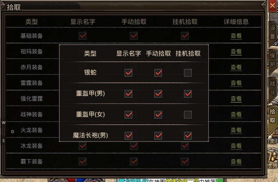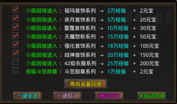火龙传奇自由回收;等到前一阶段装备拾取完毕后勾取前一等级回收按钮,同理,后续的装备也是可以这样的 !当然如果您已经买了沙捐特权,那么自动以上的均可以自动拾取与回收,不用担心垃圾装备占满背包的情况。