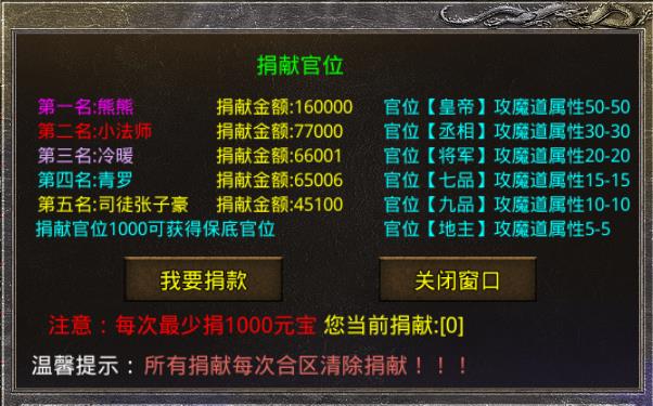 第一名:*** 捐献金额:***官位【皇帝】攻魔道属性50-50 第二名:*** 捐献金额:*** 官位【丞相】攻魔道属性30-30 第三名:*** 捐献金额:*** 官位【将军】攻魔道属性20-20 第四名:*** 捐献金额:*** 官位【七品】攻魔道属性15-15 第五名:*** 捐献金额:*** 官位【九品】攻魔道属性10-10 捐献官位1000可获得保底官位,官位【地主】攻魔道属性5-5 注意:每次最少捐1000元宝 您当前捐献:[0]温馨提示:所有捐献每次合区清除捐献!!!