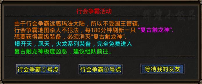 行会争霸地图杀人不犯法,每180分钟刷新一只“复古触龙神”。